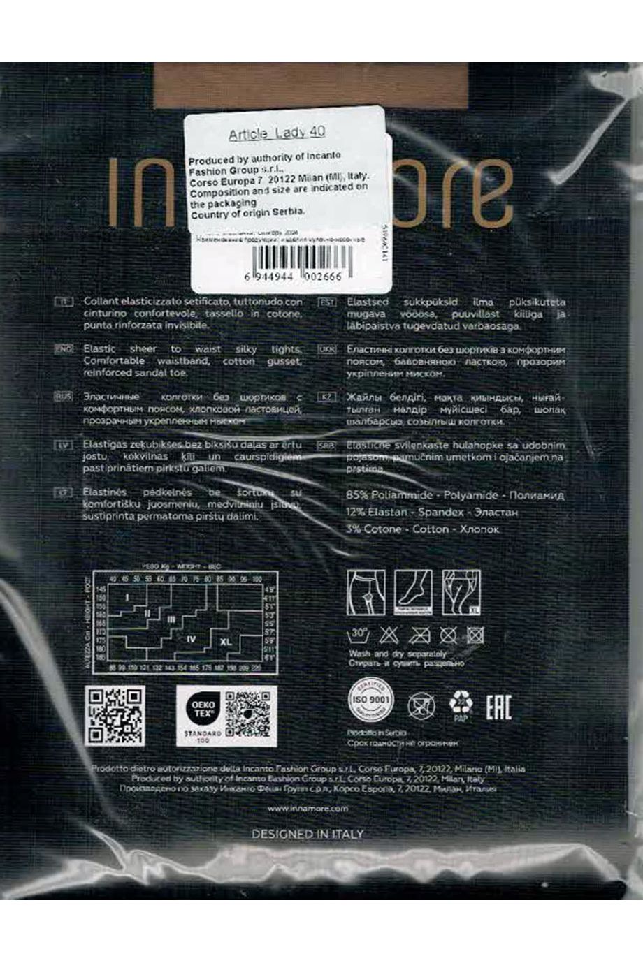 Колготки Леди 40 это качественное изделие от Итальянского бренда Иннаморе. Плотность 40 ден, полупрозрачные полностью гладкие до верха, хлопковая ластовица, удобный пояс 3 см. , усиленный носок.