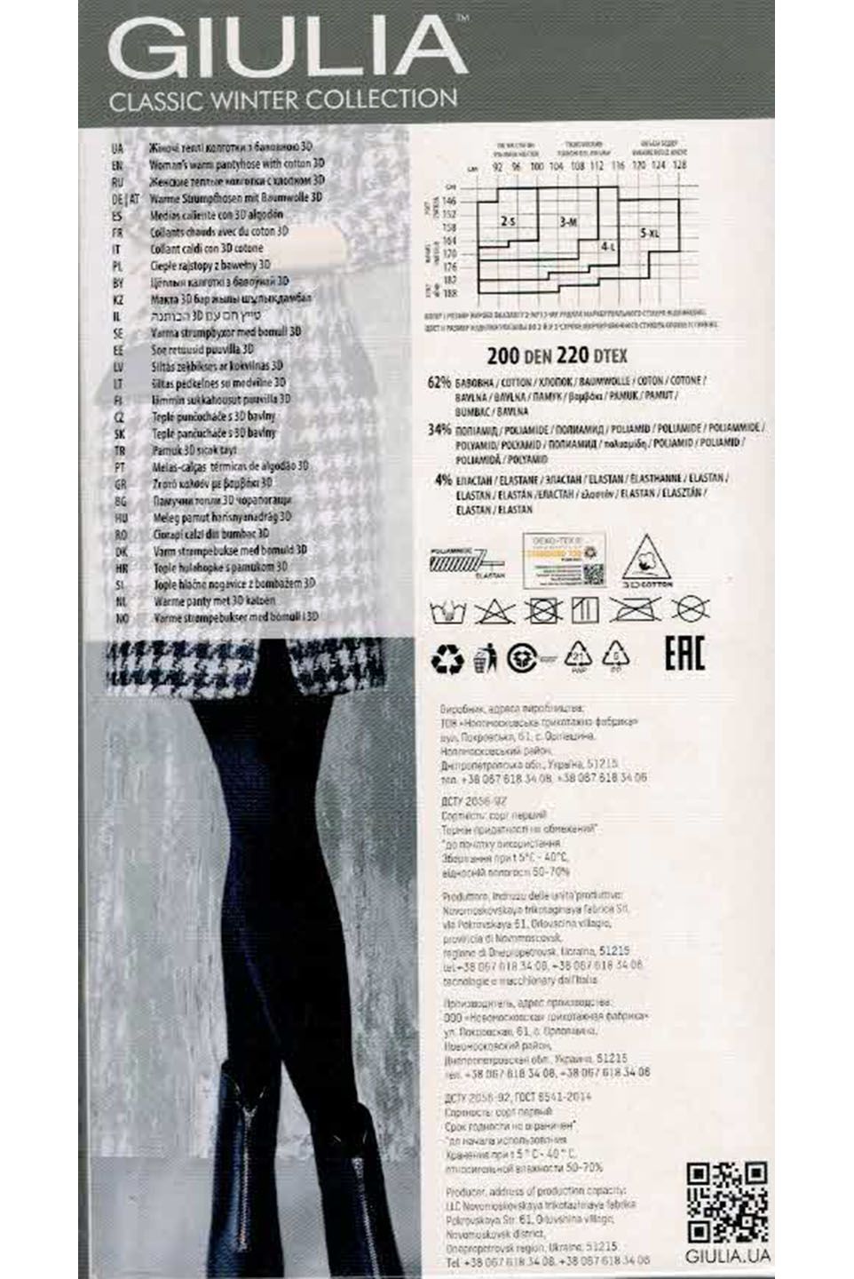 Колготки Джулия плотностью 200 ден имеют трехмерную эластичность и двойную структуру плетения, к телу слой хлопка, с внешней стороны микрофибра. За счет этого достигается высокая износостойкость и практичность в использовании. 62% хлопок, 34% полиамид 4% эластан.